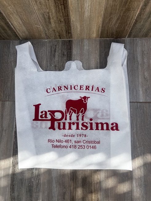 Las medidas exactas de estas bolsas ecológicas tipo camiseta son de 42 centímetros de alto x 36 centímetros de ancho y una expansión a los costados de 12 centímetros son cocidas 100% y fueron impresas en las dos caras de la bolsa con tinta roja ecológica.